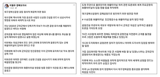 이철우 도지사는 페이스북을 통해 “공항 건설 주관부처들과 충분한 토론을 갖고 과학적·합리적으로 해결책을 찾아 대구경북신공항이 세계적 물류전문 경제공항으로 발전하기 위한 목적지까지 우리 모두 손잡고 갑시다”고 밝혔다.