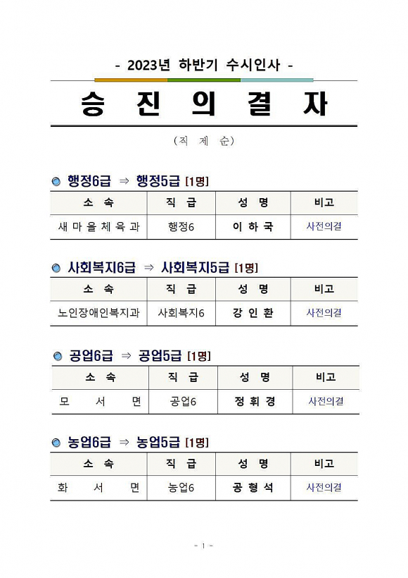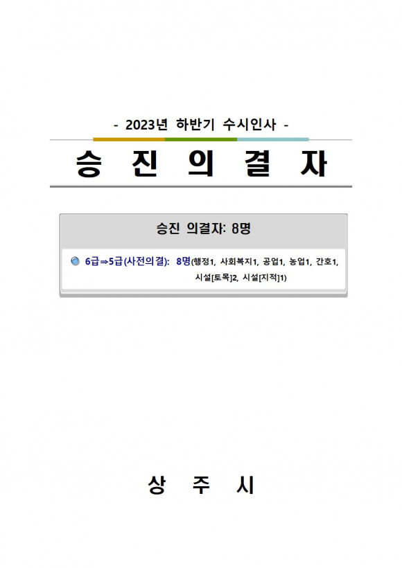 [상주=경북IT뉴스] 상주시는 2023년 하반기 6급 승진의결자 명단을 아래와 같이 발표했다.