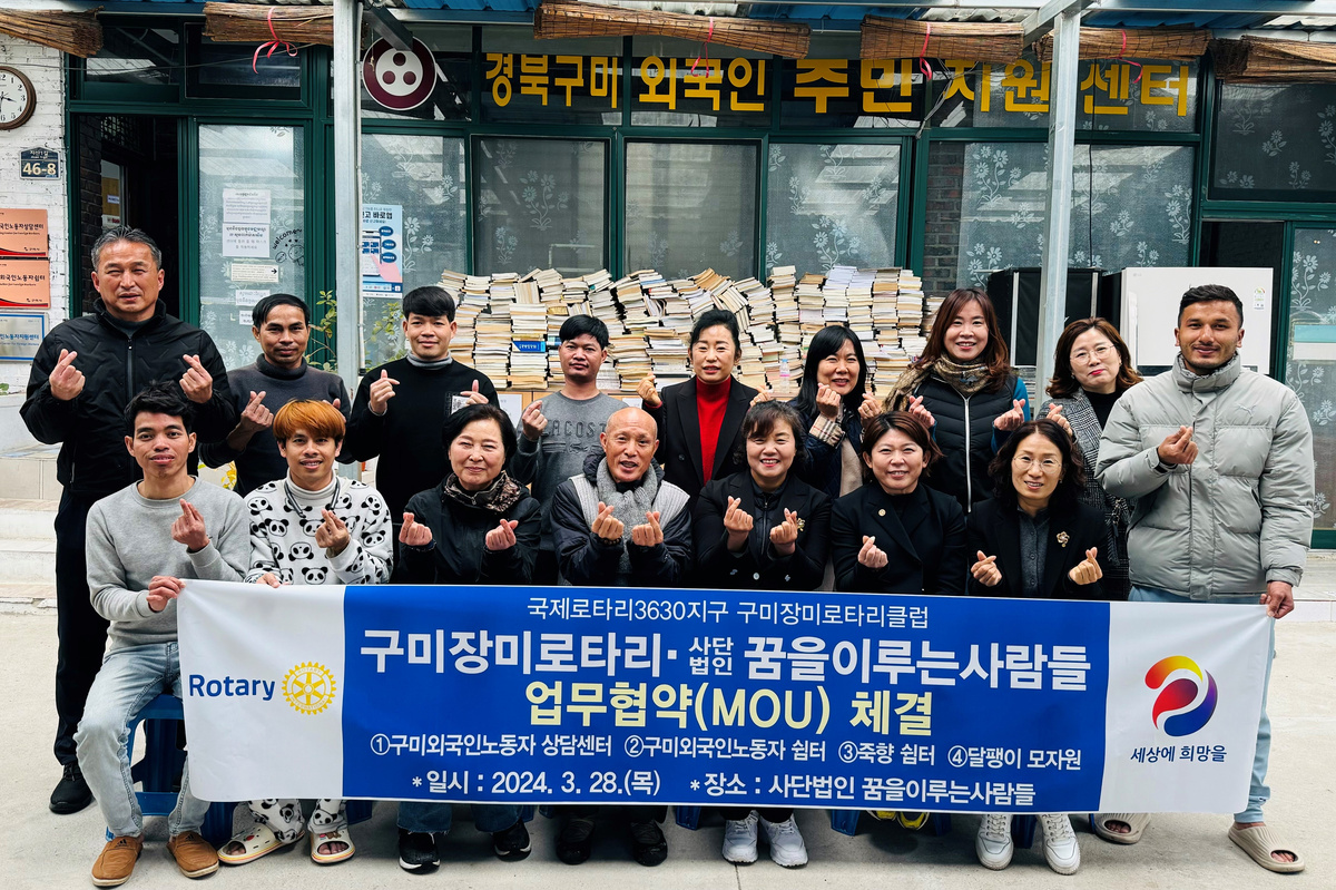 [구미=경북IT뉴스] 국제로타리 3630지구 구미장미로타리클럽 (회장 배정화)은 지난 28일, 외국인주민과 다문화가족의 안정적 정착 등을 위해 (사)꿈을이루는사람들(대표 진오스님)과 산하 시설 4곳 구미외국인노동자상담센터, 구미외국인노동자쉼터, 죽향쉼터, 달팽이모자원과 업무 협약을 체결했다.