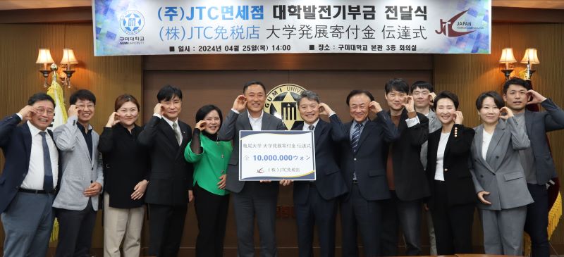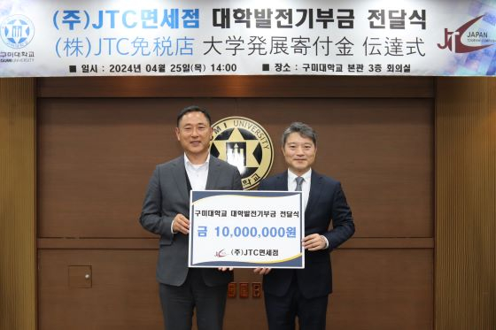 [구미=경북IT뉴스] 구미대학교(총장 이승환)는 일본 면세점 업계를 선도하는 ㈜JTC로부터 대학발전 기부금 1000만원을 전달받았다고 25일 밝혔다.