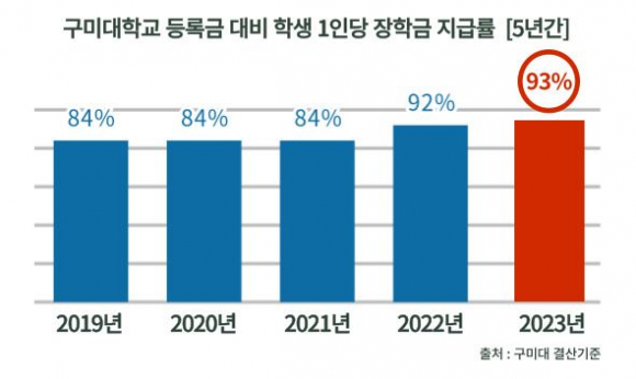 구미대의 1인당 연평균 장학금 지급률은 2018년부터 2021년까지 1인당 연평균 등록금 대비 80% 이상을 나타냈고 2022년 90%를 넘어섰다. 2023년에는 93% 이상으로 역대 최고 지급률을 기록했다.