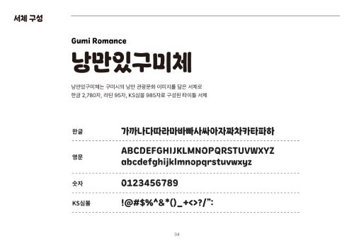 이번에 배포된 전용서체는 시의 상징성과 미래 가치를 효과적으로 전달하기 위해 개발됐으며, 지난 5월 타이틀용 2종과 본문용 1종을 최종 선정했다. 이후 전 국민 대상 네이밍 선호도 조사를 거쳐, 누구나 무료로 사용할 수 있게 저작권 등록까지 마쳤다. 이번에 선보인 서체는 △다채로운 축제와 끊임없는 문화·예술 행사로 꿈틀대는 낭만도시를 표현한 ‘낭만있구미체’ △첨단산업 생태계 구축으로 미래를 선도하는 비상 가치를 표현한 ‘구미첨단산업체’ △다 함께 잘 사는 균형있는 상생도시를 표현한 ‘구미돋움체’ 총 3종으로, 한글 2,350자, 영문 94자, 심볼 986자로 이루어져 있다. 낭만있구미체와 첨단산업체는 타이틀용 서체로 현수막, 포스터, 표지판 등 눈에 띄는 콘텐츠에 적합하며, 구미돋움체는 본문용 서체로 가독성이 요구되는 공문서, 홍보물, 안내물 등에 최적화되어 있다. 구미시청 공식 누리집(구미소개-상징-전용서체)에서 무료로 내려받을 수 있으며, 상업적 용도로도 자유롭게 활용할 수 있다. 단, 서체를 유료로 판매하거나 왜곡·변형하는 것은 금지된다.