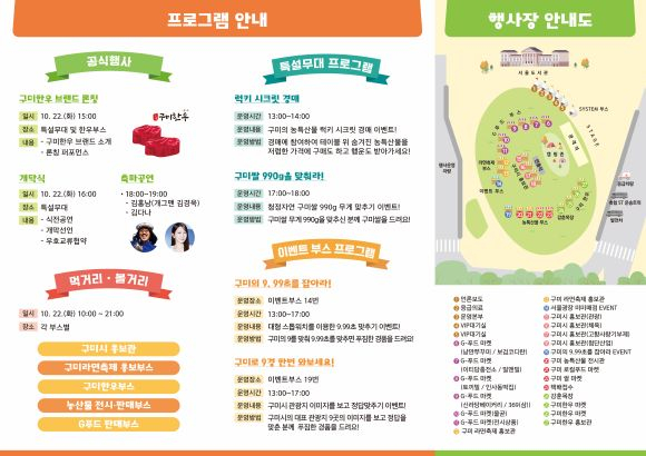행사장에서는 구미의 다양한 로컬푸드 부스가 마련된다. 구미쌀, 과일, 고구마, 버섯, 장류 등 신선한 농산물부터 최근 미국에서 인기를 끌고 있는 냉동김밥 브랜드 '올곧김밥', 떡볶이, 쭈꾸미, 마카롱 등 구미에서 생산된 다양한 식품들이 소개된다.