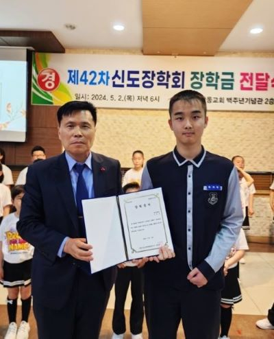 신도장학회 김점곤 대표 (사진 좌) | 김점곤 대표는 "오늘 받은 장학금으로 열심히 일해 사회에 보탬이 되는 사람으로 자라기를 바라며, 열심히 일해 번 돈을 가난한 이웃들에게 나눌 줄 아는 봉사인으로 살 수 있기를 기대한다"고 말했다.