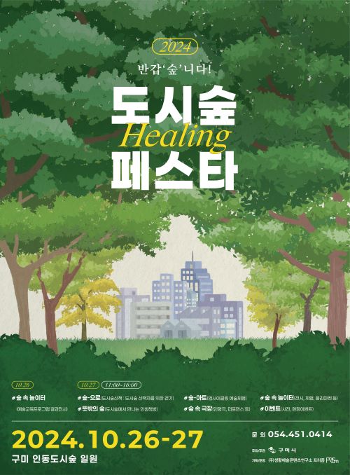 [구미=경북IT뉴스] 구미시는 10월 26일부터 이틀간 인동도시숲 일원에서 ‘2024 도시숲 힐링페스타’를 개최한다. 이번 행사는 도시숲이 지닌 상징성과 구미시의 도시 자원을 활용해 다양한 체험 프로그램과 예술 전시를 선보인다.