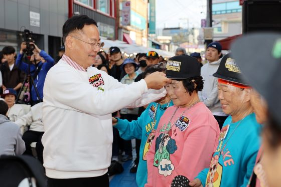 김재욱 칠곡군수는 ‘쇼미 더 할머니’라는 문구가 새겨진 우승 모자를 수니와칠공주 할머니들에게 전달했다.