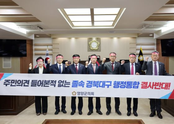 [영양=경북IT뉴스] 영양군의회(의장 김영범)는 5일 열린 제298회 임시회 제1차 본회의에서 ‘경북ㆍ대구 행정통합 반대 결의안’을 채택했다. 홍점표 의원이 대표발의(의원 전원발의)한 결의문을 통해 주민 동의 없이 경북과 대구 두 광역단체장이 일방적으로 추진하고 있는 경북ㆍ대구 행정통합에 강력히 반대하는 의사를 공식적으로 표명했다. 결의문에서는 문화적ㆍ사회적 차이 등 지역여건을 고려하지 않는 졸속 경북ㆍ대구 행정통합은 대구로의 인구 유입과 대구 중심의 행정으로 귀결될 것이며, 이는 곧 경북 내에서도 북부지역 주민이 소외되는 결과로 이어질 것이라고 지적했다. 또한, 이러한 불균형적인 통합은 지역 간 갈등과 대립으로 점철될 것이 분명하고, 경북의 자율적인 발전을 저해할 우려가 크기 때문에 경북ㆍ대구 행정통합을 철회할 것을 강력히 요구했다.