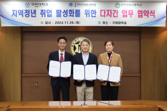 26일 구미대는 본관 대회의실에서 구미전자공업고등학교(교장 정성창), 경주정보고등학교(교장 이효숙)와의 다자간 업무협약을 가졌다.