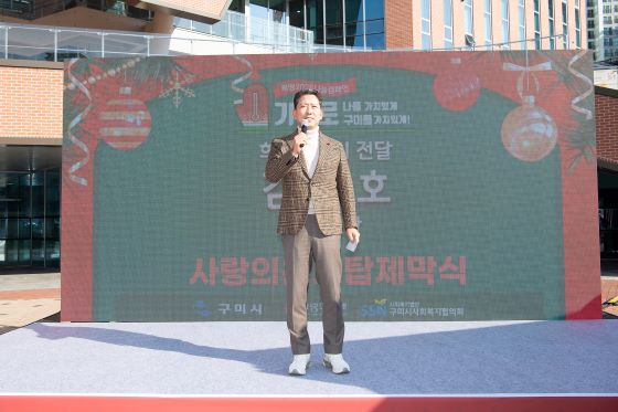 [구미=경북IT뉴스] 김장호 구미시장은 2일 양포도서관 광장에서 시민 200여명과 함께 열린 ‘희망 2025 나눔캠페인’ 사랑의 온도탑 제막식에 참석. |