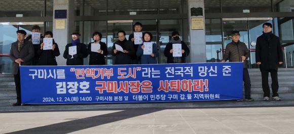 더불어민주당 구미갑·을 지역위원회는 24일, 구미시청 앞에서 김장호 구미시장이 12월 25일 열리기로 한 이승환 가수의 콘서트를 이틀 전에 취소한 것과 관련해 성명서를 발표했다.