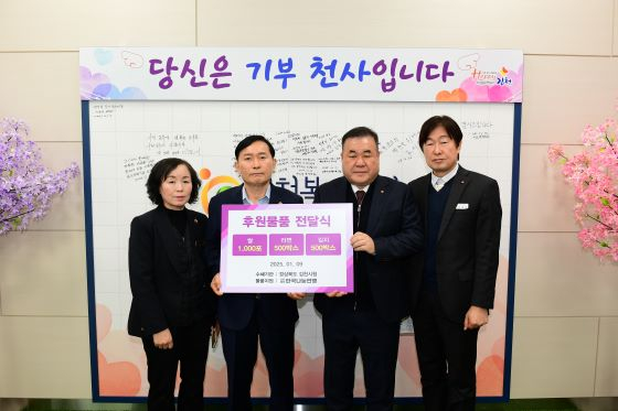 [김천=경북IT뉴스] 김천시는 지난 9일 (사)한국나눔연맹(이사장 안미란)으로부터 백미 10kg 1,000포, 컵라면 500상자, 김치(5kg) 500상자 등 총 5,000만 원 상당의 물품을 기부받았다고 밝혔다.