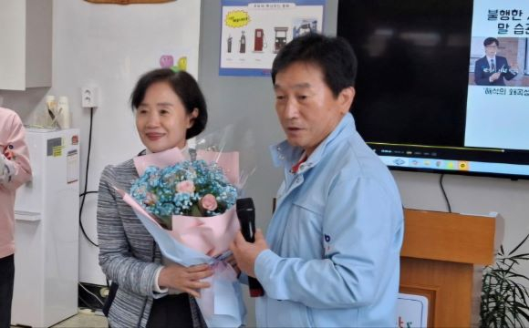 꽃다발을 전달한 이비티에스협동조합 장재도 구미금오지국장은 “진심으로 승진을 축하드리며, 노력의 결실로 개인의 만족을 만들어나간 것이다.”며, “앞날에도 행운과 기쁜 일들이 가득하시기를 기원드린다.”고 말했다.