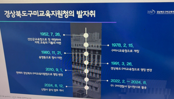 구미교육지원청 신청사는 2022년 7월 착공하여 2024년 7월 완공되기까지 약 2년의 공사 기간을 거쳐 현대적인 교육 행정 중심지로 탈바꿈했다. 이번 신청사 건립을 통해 교육 행정의 효율성을 극대화하고, 교육 가족들에게 더욱 쾌적하고 전문적인 지원 환경을 제공할 수 있게 되었다.