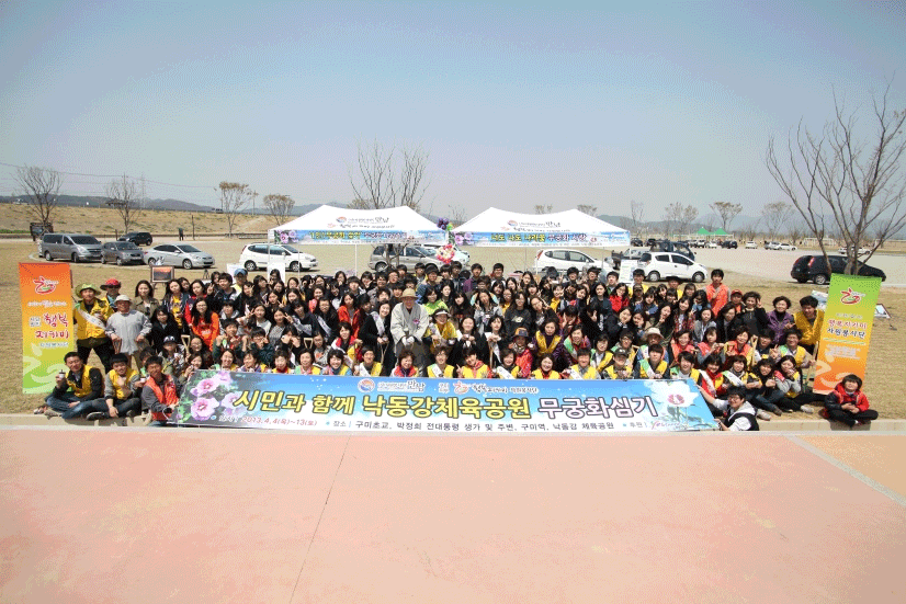 (사)자원봉사단 만남 구미지부 행복지키미(단장 이명순)가 13일 9시부터 12시까지 낙동강 체육공원에서 ‘내무궁화로 무궁화공원 만들기’ 행사를 실시했다. 이 날 행사에는 박태환 도교육위원, 봉죽사 주지 법종스님, 배승효 구미시자원봉사단체협의회장, 김정자 허브자원봉사단체 대표, 봉사단 100여명과 경북외고생70명, 구미(여)고, 봉사단체, 새터민, 1무궁화갖기 신청자들 포함 총 300여명이 참여했다. 행사 내용으로는 무궁화바로알기 교육과 사진전시, 무궁화차 시음, 무궁화 꺽꽂이 화분만들기, 무궁화심기, 내 무궁화에 명찰달기 등이며, 체육공원에는 5년생 독립수 무궁화 50그루, 무궁화 묘목 400그루, 백송100그루를 심었다. 특히 무궁화차는 평소 흔히 볼 수 없는 맛에 반응이 뜨거웠다. 이명순 단장은 "우리나라 꽃 무궁화 알리기에 참여해 주신 봉사자 및 시민들께 무한 감사 드리며, 앞으로도 꺽임 없이 꾸준히 봉사하며 나라사랑을 이어가겠다"고 말했다. 박태환 도교육위원은 "무궁화는 끝이 없는 꽃이라는 것을 오늘 새로이 알게 되었으며, 무궁화 나무를 심는 자리에 함께 해 기쁘고 우리나라도 이 무궁화처럼 끝없이 발전하는 나라가 되었으면 좋겠다"고 말했다. 봉죽사 주지 법종스님은 "모든 생물에는 뿌리가 있는데 튼튼히 뿌리를 내려서 자라는 것이 중요하다"며 "아름다운 우리나라꽃 무궁화가 전세계적으로 뻗쳐나가길 바라는 마음으로 무궁화를 심었다"고 말했다. 이날 봉사에 참여한 경북외고생은 "국화가 무궁화인데 이번 행복지키미 봉사를 통해 무궁화에 대해 알게되고 오늘 만든 꺾꽂이 화분을 잘 길러서 어서 활짝 핀 무궁화를 보고싶다"며 "이런 행사를 한다는 것은 그만큼 무궁화를 안심었다는 것인데 앞으로 좀 더 홍보해서 사람들의 마음에 길이길이 남기를 바란다"고 당부했다. 한편, 봉사단은 지난 5일 식목일에 구미역 광장에서 무궁화 행사를 진행하면서 ‘내 무궁화로 무궁화공원 만들기’ 신청자 120여명의 많은 신청서를 받은 바 있으며, 무궁화꽃이 활짝피는 8월에는 낙동강 체육공원에서 '제2회 무궁화 잔치'를 할 예정이다.